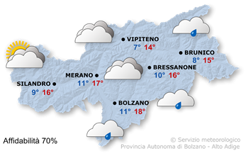 Cielo molto nuvoloso o coperto con delle piogge più probabili sui settori meridionali ed orientali del territorio. Nel pomeriggio solo locali precipitazioni con qualche schiarita. Temperature massime tra 13° in Alta Valle Isarco e 18° in Bassa Atesina e Val d'Adige.